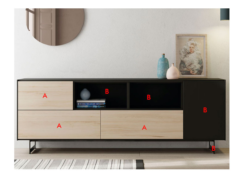 Para este aparador estarán disponibles todos los acabados Laminados y Lacados. No obstante, las patas, al ser piezas metálicas, tan sólo se podrán elegir en acabados Lacados. Para la compra directa online, sólo están disponibles una selección de los acabados "Laminados" para el Acabado A, y una selección de los acabados "Lacados" para el Acabado B. Para cualquier acabado diferente no dudes en consultarnos.