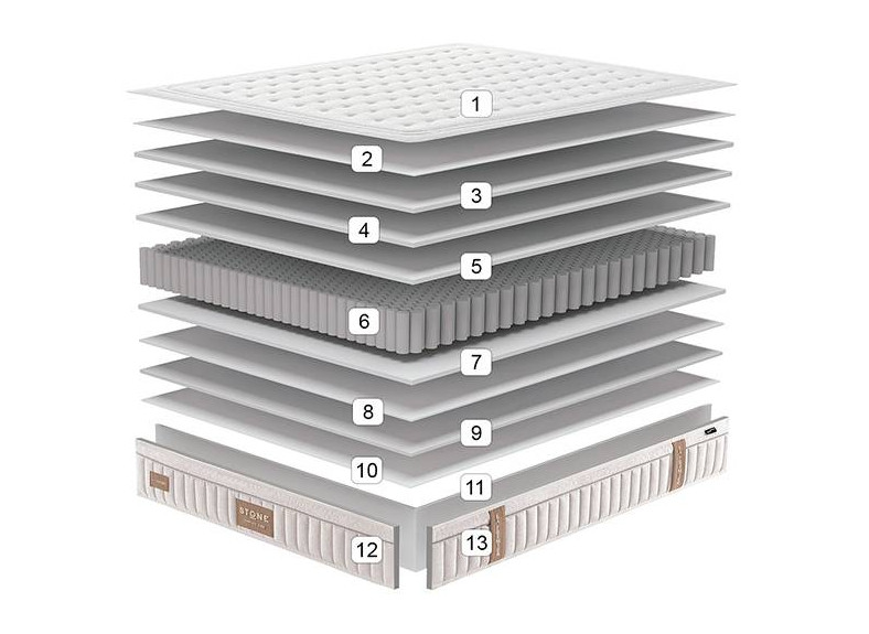 El colchón de muelles ensacados Stone, tal y como se muestra en la imagen del producto, está formado por diversas capas, ofreciendo así un confort inigualable. La composición de estas capas es la que se muestra a continuación:
