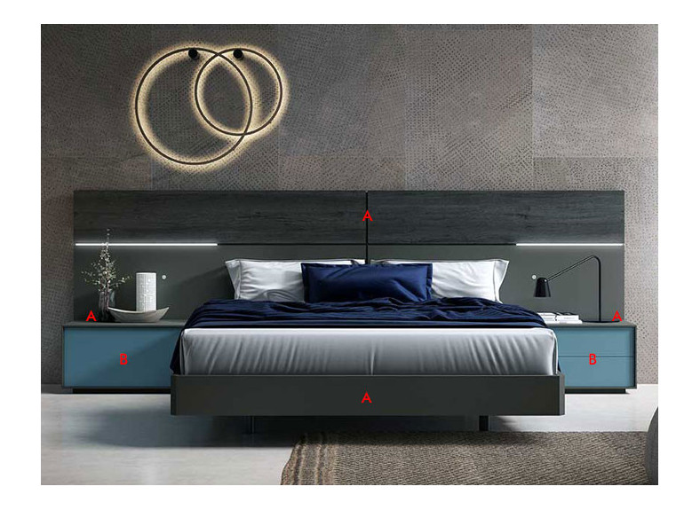 Acabados de las imágenes: Acabado A (Roble Pizarra); Acabado B (Azul City). Los colores elegidos para los acabados A y B serán aplicados en el mueble que corresponda en la imagen de muestra. Para más medidas y acabados consúltenos.