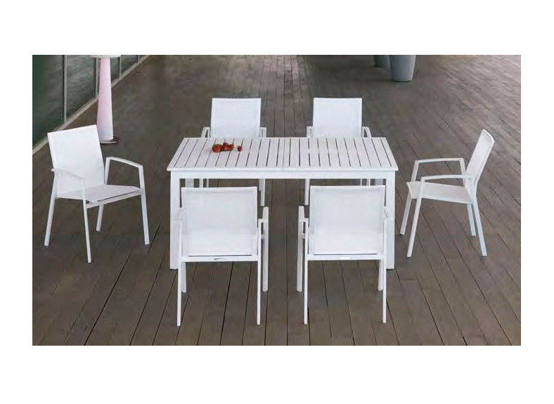 Mesa para exterior con gran versatilidad y funcionalidad. Destaca por ser extensible, por lo que no te preocupes si el número de comensales pasa de 6 a 8, ya que todos tendrán cabida de forma rápida y cómoda. Tanto la estructura como la tapa de esta mesa extensible están fabricadas con aluminio termolacado. Se trata de un metal de alta resistencia a los agentes climatológicos que se puedan producir.