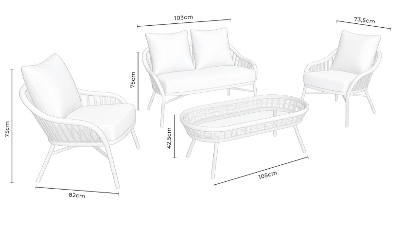 La estética del set se eleva con un sofisticado entramado de cuerda sintética en los respaldos, que aporta una textura orgánica y una transpirabilidad superior para los días más calurosos. Este conjunto incorpora cojinería de alta densidad con tejido hidrófugo, diseñada para repeler el agua y mantener su firmeza original tras un uso prolongado.