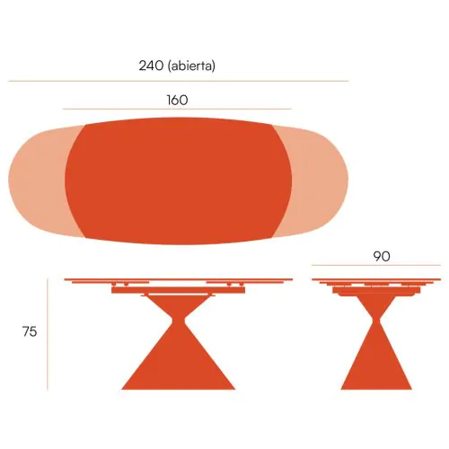 Con unas dimensiones aproximadas de 160 cm extensible a 240 cm de ancho y 90 de fondo, la mesa Rin ofrece versatilidad sin ocupar más espacio del necesario cuando está cerrada.