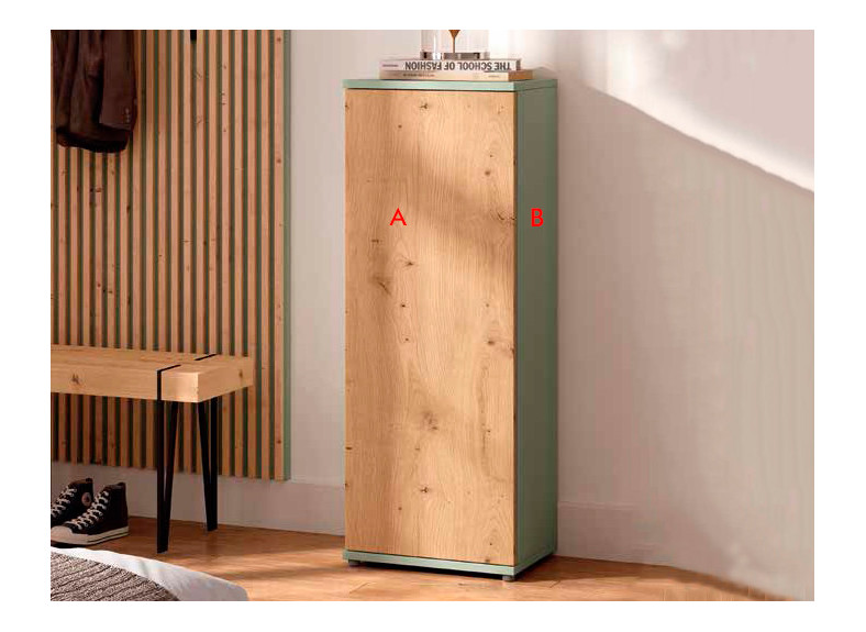 Elegante zapatero de estilo moderno con una puerta batiente hacia la izquierda de la firma Hogladih Mobiliario. Con esta pieza tendrás espacio de sobra para guardar todos tus zapatos y tenerlos todos a la vista de una manera rápida y cómoda. Su forma estrecha ocupará poco espacio en tu entrada y podrás decorar su tapa superior con algún tipo de decoración.
