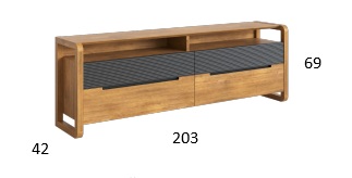 El conjunto está compuesto por un mueble de televisión de 203 cm, que ofrece una excelente capacidad de almacenamiento gracias a sus cuatro cajones y dos huecos abiertos, ideales para organizar dispositivos multimedia, mandos o accesorios del día a día. A juego encontramos una mesa de centro con un cajón y hueco, práctica y funcional para mantener el salón ordenado sin renunciar al estilo.