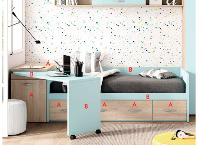 La zona de descanso, cuenta con una cama compacta, para colchones de 90x190 cm, con 4 cajones de gran capacidad de almacenamiento en su parte inferior. No precisa de somier, por lo que el colchón se podrá apoyar directamente sobre su estructura. Por su parte, la zona para el estudio, está formada por un arcón que incorpora una mesa giratoria en 180º con ruedas, para facilitar esta rotación. El arcón contiene dos estantes interiores de igual capacidad de almacenamiento.