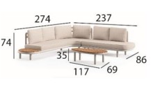 Acabado de las imágenes: Estructura en aluminio. Tapizado resistente al exterior. Superficie de la mesa en teca natural.
