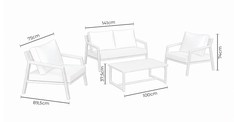 Compuesto por un sofá de dos plazas, dos sillones individuales y una mesa de centro, el set ofrece una solución completa para crear una zona de descanso cómoda y estilosa. La mesa incorpora un elegante sobre porcelánico, que aporta un acabado refinado y ligero, ideal para acompañar momentos de relax o reuniones al aire libre.